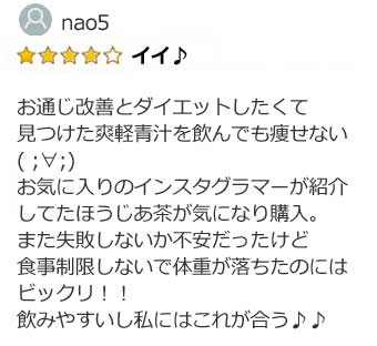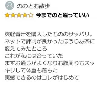 「はじめは爽軽青汁を飲んでいたけれど、ほうじあ茶に切り替えた」という口コミもいくつかありました。