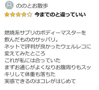 「はじめはボディーマスターを飲んでいたけれど、ウェルレコに切り替えた」という口コミもいくつかありました。